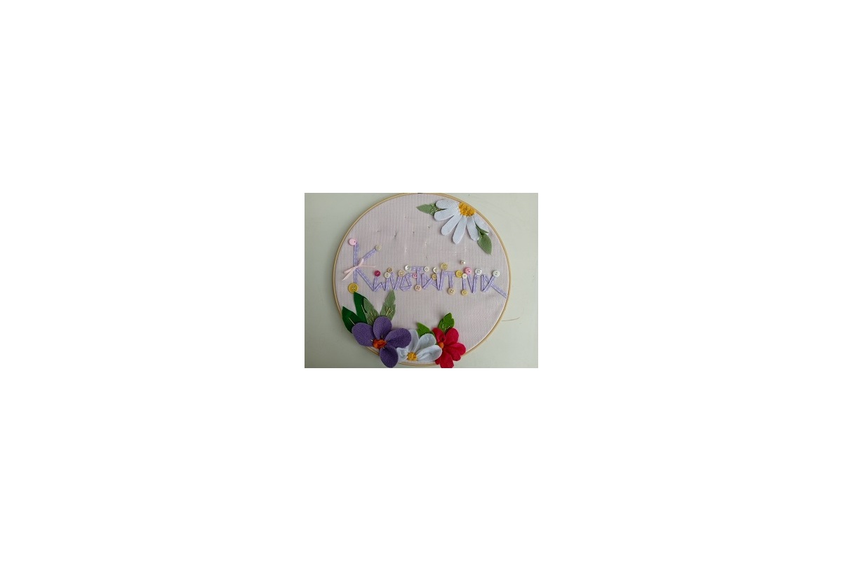 Materials: Embroidery hoop, cotton fabric, felt, lace, Gutterman thread, ribbons, buttons, beats, perles.